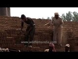 Workers from Bihar state use make-shift wheel-barrows to move bricks from the kiln to the stock-pile, after they have been baked, cooled and readied for sale. They are piled up high, waiting for trucks to come and purchase them and carry them away to construction sites, having been purchased by contractors and 'thekedars' for the real estate developments of Uttar Pradesh state, India.