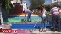 Antalya'nın Manavgat İlçesi'nde 'Bir Fırça da Sen Sür' sloganıyla toplanan bir grup, bazı illerde yapılan merdiven boyama eylemlerine destek için Hasan Fehmi Boztepe Caddesi'ndeki merdivenleri gökkuşağı renklerine boyadı.