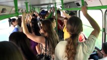 Russian flashmob sings a Russian national song in a bus