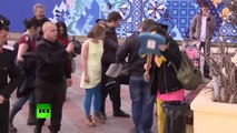 The men, who were wearing St George ribbons which commemorate the victory over Nazi Germany in World War Two, used pepper spray and poured rubbish and green antiseptic over them.