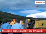 İzmir'in Menemen İlçesi'ne Çukur Köy Mahallesi'nde, virajı alamayan midibüs devrildi, 6 kişi öldü, 5'i ağır 31 kişi yaralandı.