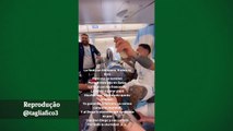 Jogadores argentinos comemoram em avião na volta para a Argentina.