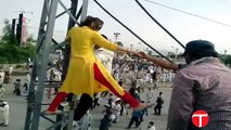 Female Anchor ( Gharida Farooqi ) of samaa tv Climbing stunt on electric Poll