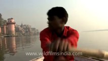 Birth and death in the city of birth and death! A man collects human ashes and dumps them to a side, even as a corpse burns on the pyre, at the edge of the Ganges river in the ancient city of Benaras, known equally for sarees, filth, squalor, re-birth, religion and more... A family stands by as their loved ones' corpse burns to ashes, along India's Ganga river. Pigeons fly around, cows amble by, as piles of wood stand nearby, for use in cremation ceremonies along the famous Burning Ghats of Varanasi's river-side, in this ancient city of India.