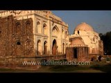 Facing the tombs is the baoli or step-well, a well approached by descending a flight of wide steps. On both ends of the stairs are thick walls into which cells were traditionally made. This baoli has cells too, but shallow ones: they're wide enough only for one to sit on. A ledge runs along the outside of the cells, right to the end of the baoli, into a covered chamber which overlooks a well -- long since silted up. Above ground, the baoli has an interesting feature: two domed turrets at either end of the chamber overlooking the well. From the turrets, two stone-built water channels lead out a short way. Beyond the baoli is the smaller of the wall mosques which is plastered black with age and graffiti-riddled by visitors who've scratched their names here and there, it still has a charm about it.