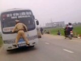 Un policier accroché à l'avant d'un bus au Vietnam