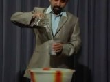 A weird science "experiment" where a spectator drops a special blue ball into the open bottle of water. The ball slowly sinks down through the water. You turn the bottle mouth down...the blue ball slowly sinks down again...and finally drops out of the bottle...somehow leaving the water suspended! This cool visual is also a brilliant convincer that nothing is secretly blocking the water.