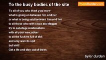 I love myself Merciful Prideful Overly nice Rough and ready Tough Angry at the world Not sane Tough shittiyler durdenhttp://www.poemhunter.com/poem/important-2/