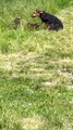 Dog Ava joue avec des ratons laveurs