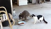 Sneaky Raccoon Steals Food From Cats