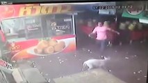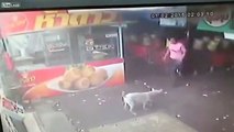 In CCTV footage filmed in what appears to be a market area, a man in a pink shirt takes exception to the animal.