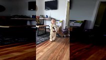 He lurches towards the dog which is wagging its tail thinking it is getting attention.