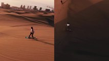 Devin Super Tramp is playing with his friends in New Zealand and have fun with a bodyboard on a sand.