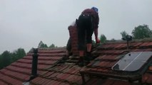 Deux abrutis essayent d'enlever une cheminée sur le toit d'une maison