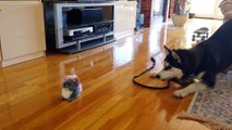 Funny Siberian Husky Puppy Scared by a Talking Toy