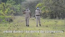 On le voit être en train de donner les coups de bâton au sol pour tenter d’effrayer l’animal, mais celui-ci ne semble pas trop impressionné, le garde tombe à terre, ça y est, il va finir en bifteck. Mais le leopard change d’avis et decide de suivre son chemin.