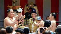 Sumo wrestlers hold screaming babies aloft in ancient crying contest