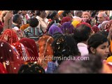 Crowd dance as palanquin of Lord Krishna is taken out during a procession in the streets of Gokul, Uttar Pradesh. A procession is taken out before the Holi festival celebration.