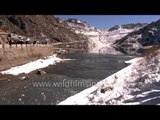 Driving between the snowy mountains of Sikkim which is a part of Eastern Himalayas in India.