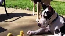 Un danois joue avec des poussins