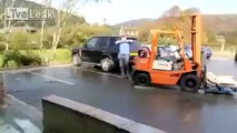 Forklift destroys car park fish pond