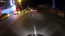 Motorcycle Tries To Pass Between Two Cars
