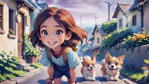 Cute girl walks down a sunny suburban street accompanied by a happy dog .