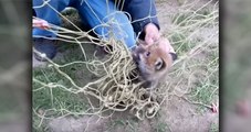 En Russie, un bébé renard coincé dans un bocal est libéré avant de repartir immédiatement dans la forêt.