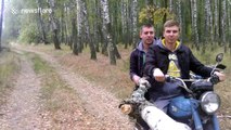 Three guys use birch tree branch as selfie stick
