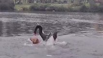 Un chien se fait attaquer par un cygne dans un lac