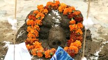 Hindus make a traditional cow dung hillock to symbolize Mount Govardhan, the mountain which was once lifted by Lord Krishna during Govardhan puja in Agra.