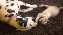 Cutest play fight ever between Dalmatian and kitten