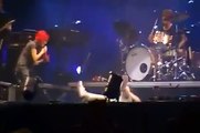 Le 8 novembre 2014 lors dun concert du groupe musical Paramore à Rio au Brésil, une fan est invitée sur scène. Elle tente de sauter dune caisse à roulettes, mais tombe à la renverse. Le groupe va alors avoir une réaction rigolote.