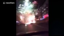 Dramatic footage has emerged from China of a man's firework market stall off the back of a truck exploding in spectacular fashion.