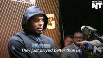 After losing the Super Bowl, Panthers quarterback Cam Newton prematurely exits the post- game press conference. After sitting at the press conference somberly for about 3 minutes ignoring questions, he got up and left. At one point, he did say “We’ll be back” but didn’t provide any other information. It looks like Cam is taking the loss pretty hard!