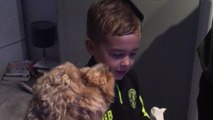 Adorable dog waits for her turn when owners brush the child's hair