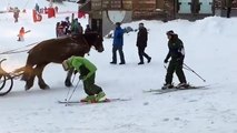 Hombre ebrio trata de esquiar
