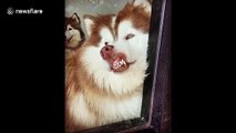 Siberian husky smiles at owner by pressing face against window in hilarious scene