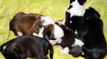 chez Les bébés Bergers Blanc Suisses ont 22 jours mais ils ont la visite d'un intrus plus âgé qui n'est pas rassuré....