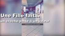 Un voleur est poursuivi par un agent de sécurité dans un centre commercial des Etats-Unis. Alors qu’il court pour s’enfuir, une jeune fille décide de s’occuper de son cas. C’est alors qu’elle lui fait un gros croche-patte. Le voleur va tout de suite tomber au sol et se faire arrêter. On dit bravo ! Beau réflexe !