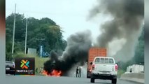 Las cámaras de seguridad de San Miguel, en Buenos Aires, capturaron un accidente de tránsito entre un carro y unos motociclistas. En el video se ve al automóvil doblando lentamente hacia la izquierda, en ese momento un motociclista y su compañero chocaron con el carro y salieron disparados de la moto.