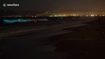 A strong red tide is causing neon blue bioluminescence thats visible at night as tiny light-producing organisms get stirred up as the waves break. La Jolla,CA .