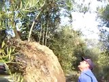 Video explicativo de los principios de la poda de producción del olivo, mientras un maestro podador va realizando esta técnica utilizando la motosierra y un .