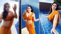 A man dancing in a swimsuit at the edge of a swimming pool