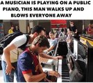 a musician is playing on apublic piano, this man walks up and blows everyone away