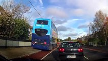 Double-decker bus drives on pavement to overtake queue of traffic