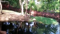 Dans le Nehru Zoological Park en Inde, un homme ivre s'est jeté dans un enclos à lions pour se battre avec les félins. Il a commencé à s'approcher de l'un d'entre eux alors qu'il était dans l'eau et l'a provoqué. Finalement, cet idiot est vite parti se mettre à l'abri.
