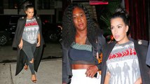 Well it looks like its Battle of the Butts. Kim Kardashian bumped into her old friend Serena Williams on the streets in London, just outside Harrods. The World Number One tennis player couldnt resist touching kims baby bump. Looked like they did some catching up and embraced each other while posing for their fans. Serena looked sporty in her white and purple tank top and dark grey fitting leggings, which showed off her bootylicious curves. Whereas Kim stole the show in her low plunging top and flaunting ample cleavage. The frill on the waist creatively hid her growing baby bump. Minimal accessories and neat transparent strapy sandals gave her a simple but stunning look.