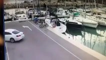 Il oublie de mettre le frein à main de sa voiture garée sur le port... FAIL !