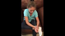 Elle fait passer un lacet de chaussure dans le collier et l’attache avec l’autre lacet de sa chaussure. Ensuite, elle essaie de tendre les pieds et les mains en même temps et les pédalent.